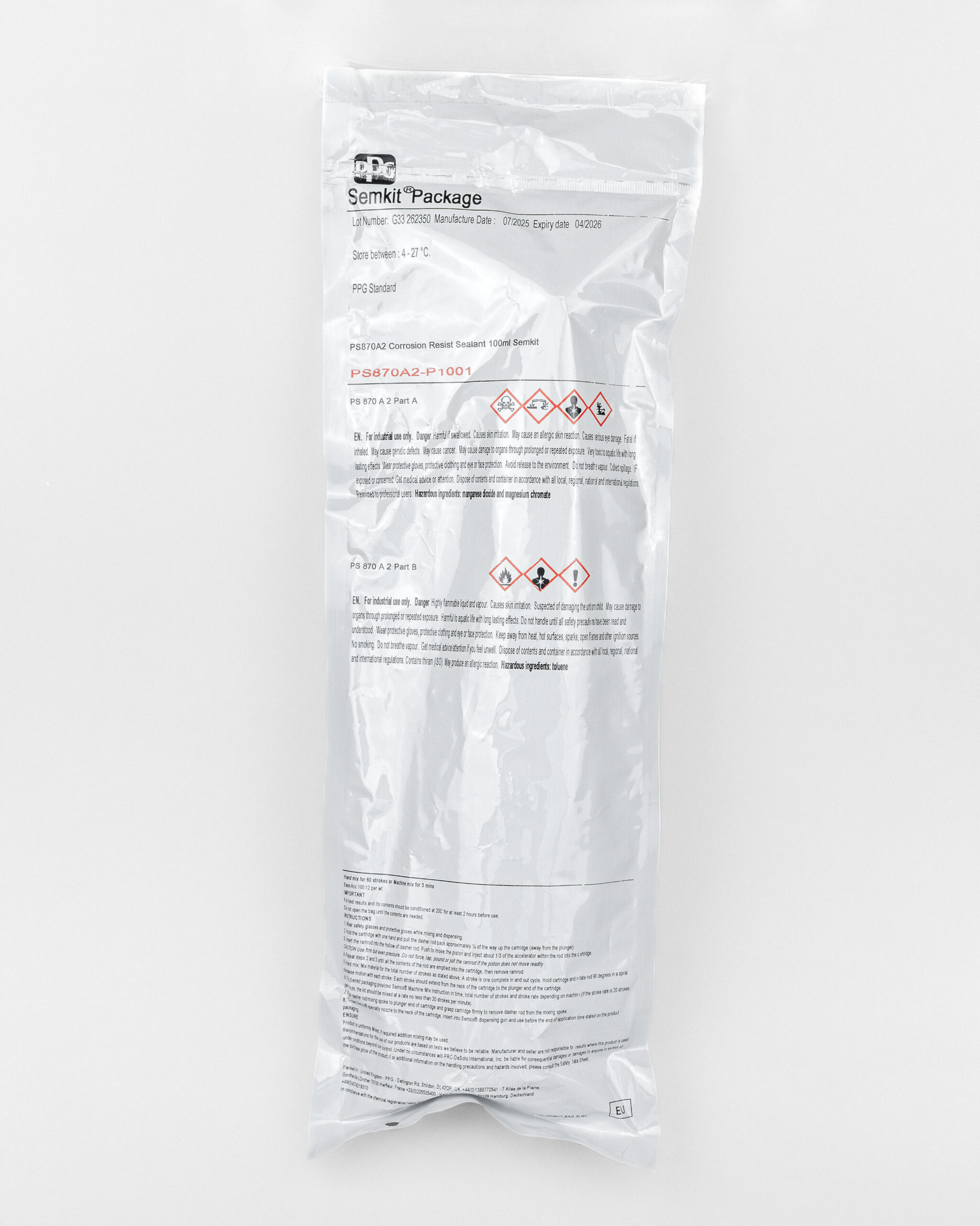 The PPG PS870A-2 (100-ML-SEMKIT) is a high-performance corrosion inhibitive sealant specifically designed for the aerospace industry. With its wide service temperature range from -65°F (-54°C) to 250°F (121°C) and intermittent peaks up to 275°F (135°C), this sealant provides robust protection under extreme conditions.